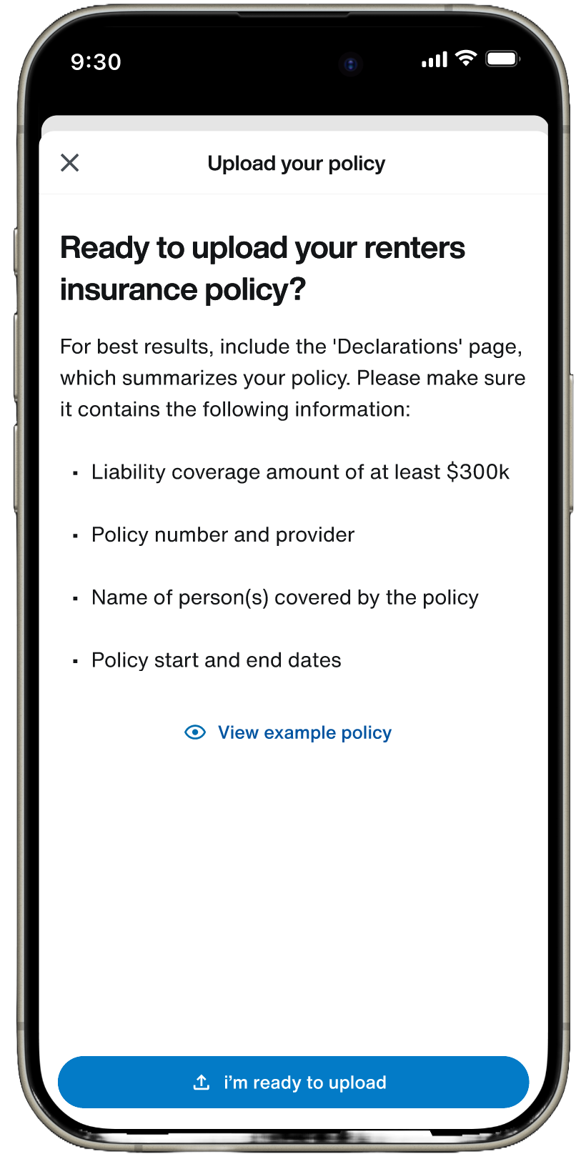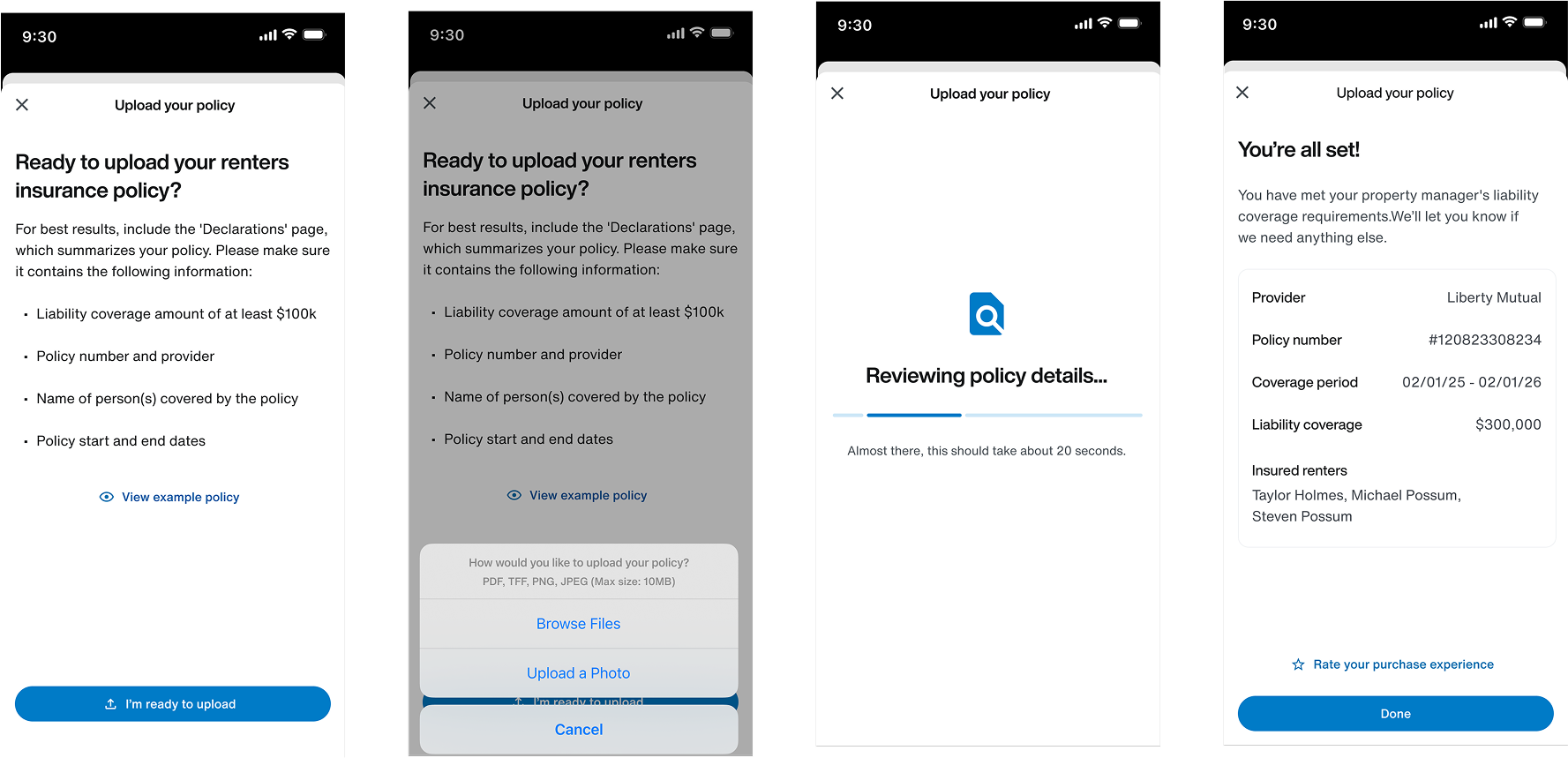 Although this feature was surfaced in the resident-facing app, property managers were an equally important user group. After a resident uploaded their policy, the property manager would review the scanned results and use them to track insurance coverage across their portfolio. This meant that every screen and every piece of language had to be consistent, accurate, and aligned across both user experiences.